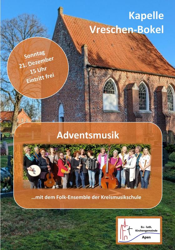 Am Sonntag, 21. Dezember 2025 (vierter Advent), erklingt um 15 Uhr in der Kapelle Vreschen-Bokel Adventsmusik aus aller Welt. Das Folk-Ensemble der Kreismusikschule Ammerland unter der Leitung von Barbara Andrae spielt mit Blockflöten, Dudelsäcken, Geige, Klarinette, Gitarre, Mandoline, Cello, Kontrabass, Akkordeon und weiteren Instrumenten Lieder und Melodien aus verschiedenen europäischen Regionen, z.B. Italien, Frankreich, Großbritannien und Skandinavien. Die Musikerinnen laden auch zum Mitsingen ein. Der Eintritt ist frei, herzlich willkommen!